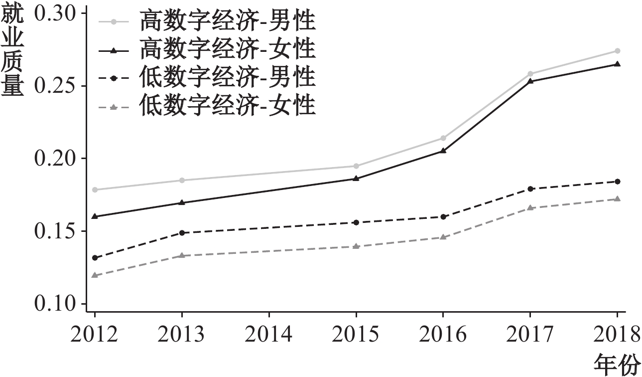 长期以来,中国劳动力市场存在着性别和地区的双重结构性差异,女性劳动者在就业质量方面普遍处于不利地位,数字经济发展为弥合就业质量的性别鸿沟提供新契机。图1展示了2012—2018年农民工就业质量的变化趋势,呈现出以下三个特征:第一,在数字经济发展水平相同的地区,相较于男性农民工,女性农民工的就业质量偏低,这表明就业质量的性别鸿沟是劳动市场普遍存在的事实。第二,在性别相同的情况下,农民工在数字经济发展水平较高地区的就业质量始终高于较低地区,且这种差距随着时间推移持续扩大。根据图1所示,2012年数字经济发展水平较高地区男性农民工的就业质量指数明显高于数字经济发展水平较低地区,到2018年,这一差距更加明显。上述现象表明,数字经济发展能够提升农民工就业质量,并且具有时间累积效应。第三,在数字经济发展水平较低的地区,男性和女性农民工就业质量提升的速度大致保持平行趋势,而在数字经济发展水平较高的地区,女性农民工的就业质量上升速度明显高于男性农民工,这表明数字经济发展水平的提升有助于就业质量性别鸿沟的弥合。