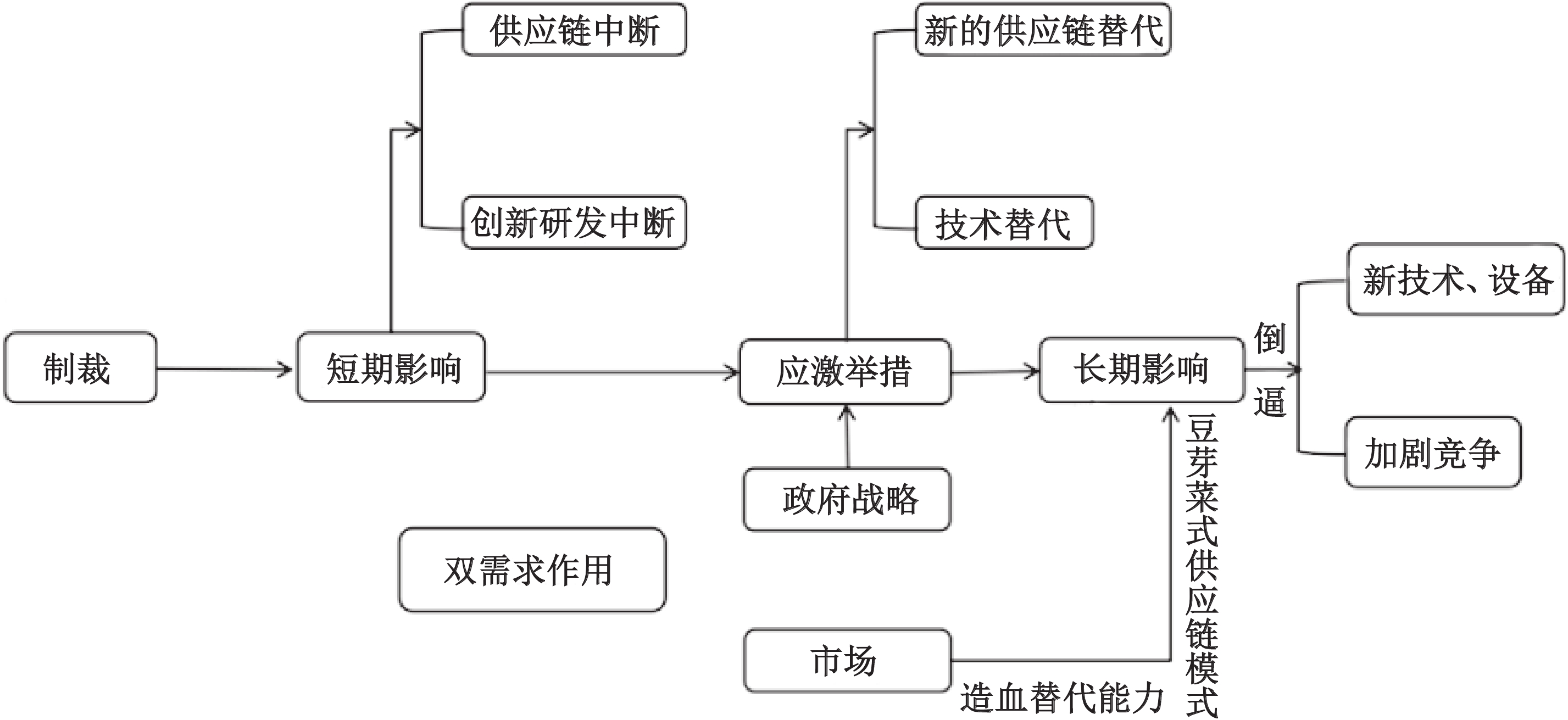 | 图 1 实体清单制裁对我国企业长短期影响机制以及政府和市场的调节作用 |