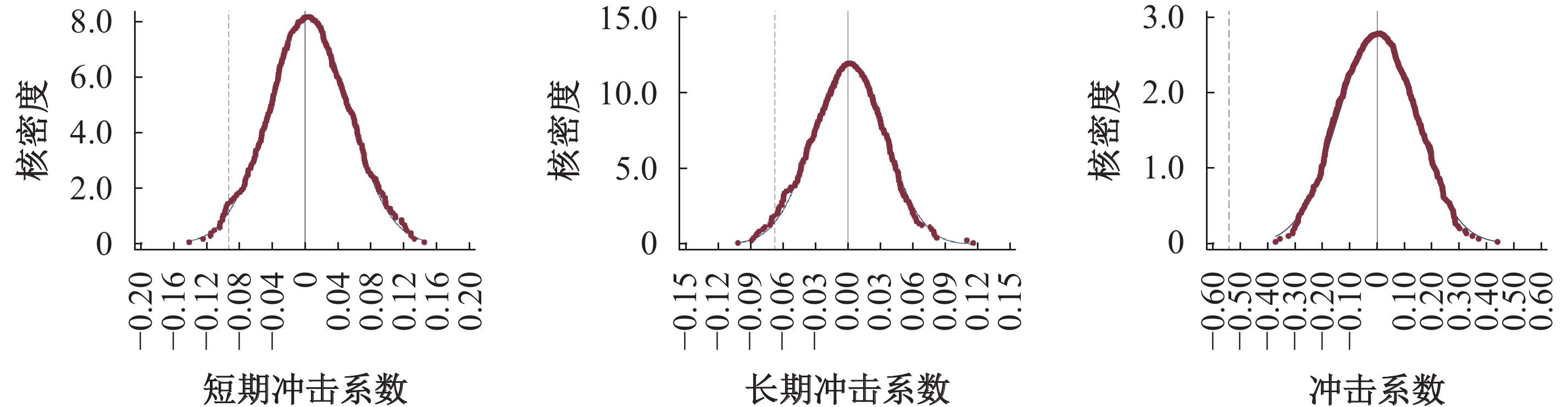 为确定实体清单制裁前,实验组和控制组的出口增速是否呈现基本相同的变化,而在实体清单发布后两者是否开始出现明显差异,本文采用对上述加入控制变量后的回归方程进行平行趋势检验。图2分别报告了以中国出口增速为因变量和美国进口增速为因变量的模型的平行趋势检验的结果,图3则分别报告了上述回归的安慰剂检验结果。可以看出,本文设计均满足平行趋势假定,且安慰剂检验中各变量系数的核密度近似正态分布,且估计值在95%置信水平显著。