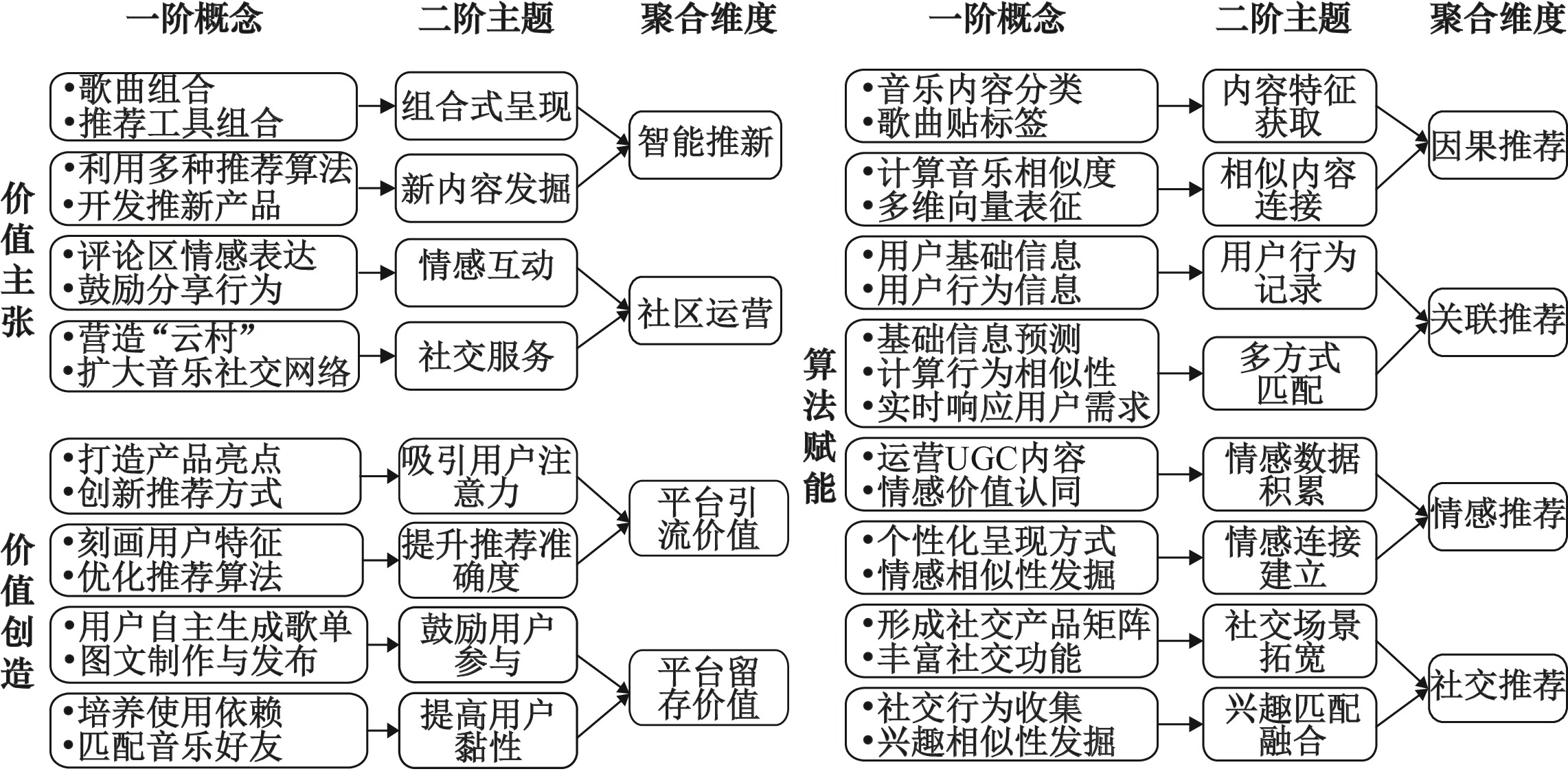 商业模式的构建是企业提出和实现价值主张的过程,通过提供新颖、独特、契合需要的价值主张吸引和留住顾客, 成为企业获取竞争优势的重要途径。价值主张代表了企业通过产品或服务为用户提供的价值,不同的价值主张将影响产品或服务的开发,因此对价值主张的识别能够更好地理解企业行为。在内容平台商业模式发展过程中,商业模式不断转型和变革,随着算法技术的嵌入,内容平台商业模式的典型代表——数字音乐商业模式呈现以歌曲个性化推荐为核心的“内容为王”和聚焦音乐社交的“社区至上”两种算法赋能模式,两者的价值主张有着本质区别,具有不同的商业模式创新路径。案例分析发现,网易云音乐的价值主张是“分享与发现音乐产品”,其中“分享”指用户之间沟通交流构建社交网络;“发现”指在推荐算法赋能下为用户匹配更多优质音乐,下面展开详细论述。