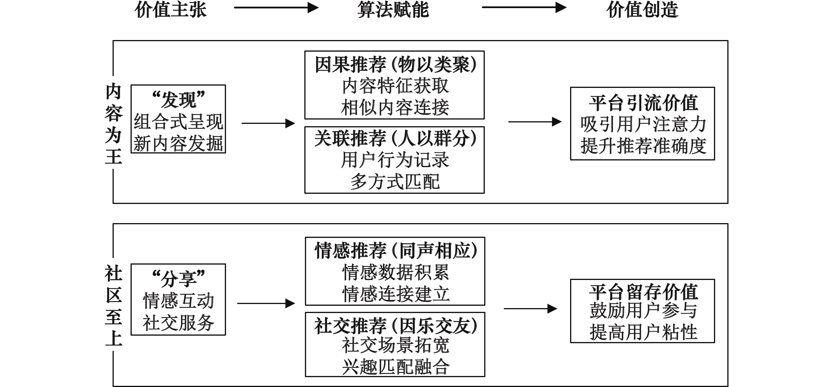 (1)内容平台根据推荐算法的内容主导与社区主导推荐场景,形成了“内容为王”和“社区至上”两种算法赋能模式并呈现出不同的价值主张。通过案例分析,“内容为王”的价值主张为智能推新,具体表现为产品的组合式呈现和新内容发掘,目的是扩大音乐内容的广度和推荐的准确性,深入激发满足用户的潜在需求,帮助用户发现个性化、新颖的音乐;“社区至上”的价值主张为社区运营,具体表现为用户之间的情感互动以及平台提供的社交服务,通过搭建互动和分享的空间场景衍生社交属性,为用户提供情感价值,形成差异化竞争力。