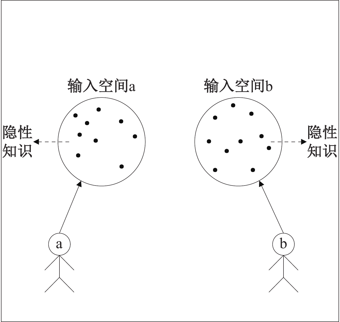 (1)在对话、交流、讨论或观察中,知识型员工将其头脑中与组织实践相关的隐性知识的基本线索表达出来,包括话语、动作、信息或符号等,从而激活两个或多个“心理空间”,即输入空间a和输入空间b(为了便于表达,此处仅以两个人之间的互动为例,如图3所示)。
