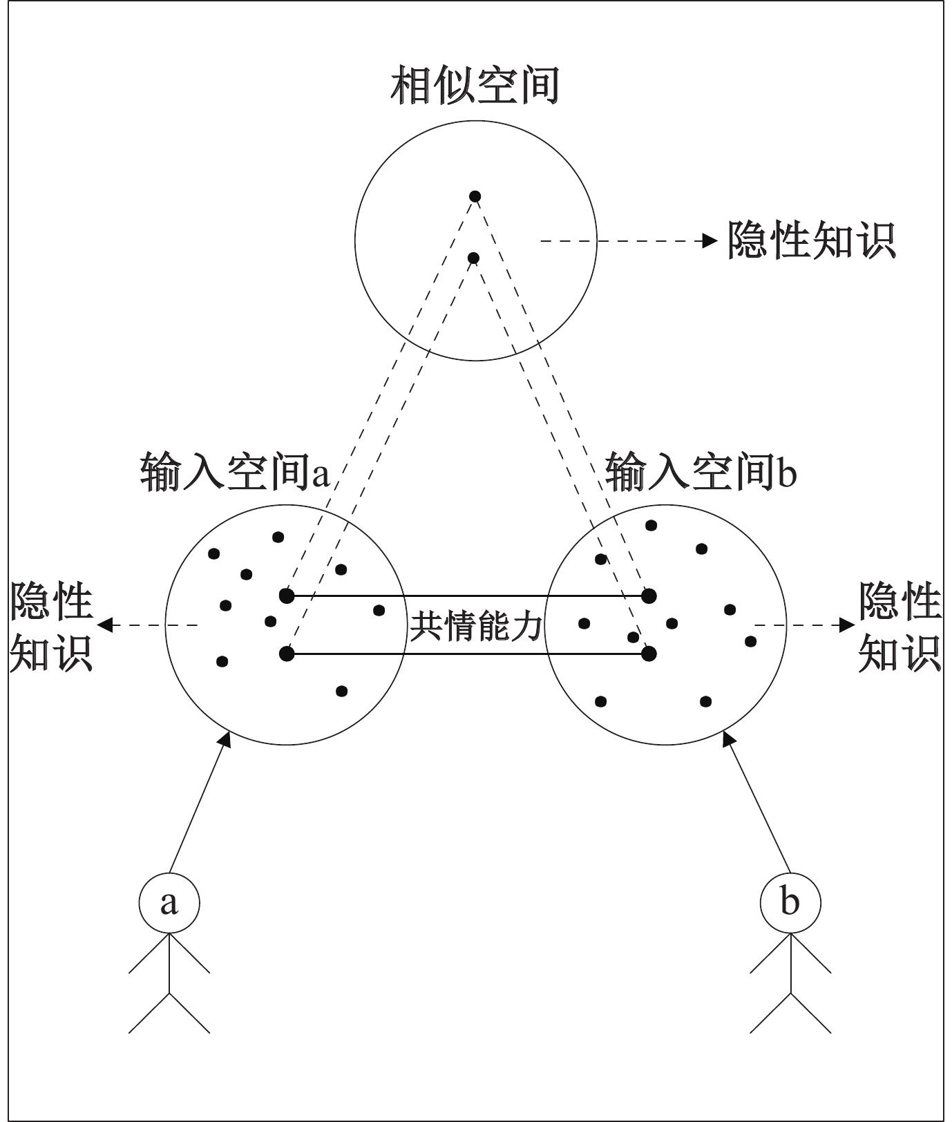 (2)在持续地对话、交流、讨论和观察中,知识型员工相互理解和相互体会不同心理空间(a,b)之间所蕴含的“相似性”(共情能力的作用)。比如,一些共有的抽象结构、组织、符号和要素等(“比喻”在其中扮演了关键角色