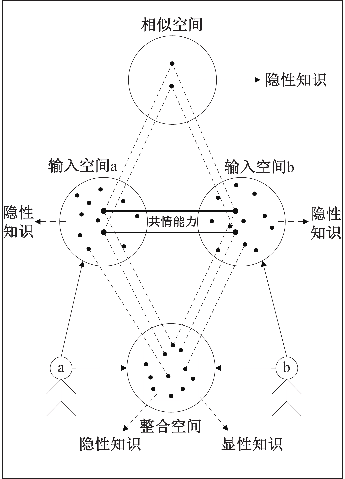 (3)在持续地对话、交流、讨论或观察中,知识型员工以“相似空间”为参照,对两个“输入空间(a,b)”中的基本线索进行分析、比较、归纳或推理等,从而形成为组织成员所共享的新的心理空间(整合空间,如图5所示)——这就是知识型员工共同创造出的组织层面的新的共享隐性知识。