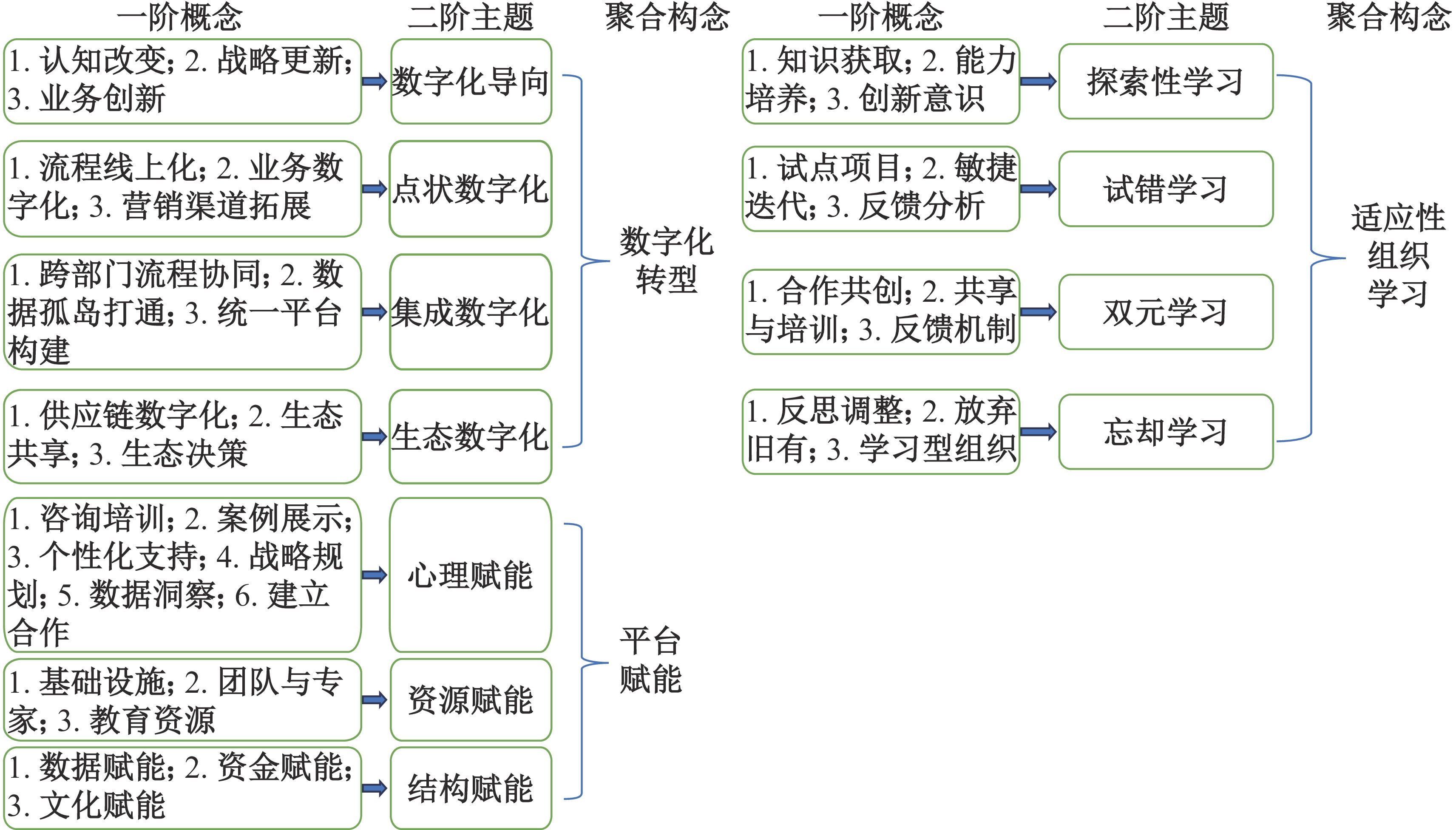 本研究采用Gioia等人(2013)提出的一阶和二阶结构化数据分析方法对数据进行编码,分析过程分为四个阶段。一是概念化编码的初步阶段:以案例研究对象(人员)为中心,研究者采用双盲方法独立进行编码。在此阶段,研究者忠实于受访者的原始表述,直接从收集到的数据中提取概念,并对其进行分类。二是一阶概念的进一步处理:研究者作为分析的核心,根据研究主题对一阶概念进行处理,以形成二阶主题构念。三是聚合构念的形成:研究者将具有相似性的二阶主题进行整合,形成聚合构念。本研究中,聚合构念包括平台赋能、适应性组织学习和数字化转型。四是编码结果的验证与整合:在编码整合过程中,研究团队成员相互讨论,对有歧义的编码概念进行统一。通过查找和补充资料,确保数据与研究核心问题的契合。若发现数据存在偏差或与研究逻辑不符,研究者将向企业进行验证、补充调研或剔除不匹配的数据。最终,形成一个完整的数据分析结构,如图2所示。