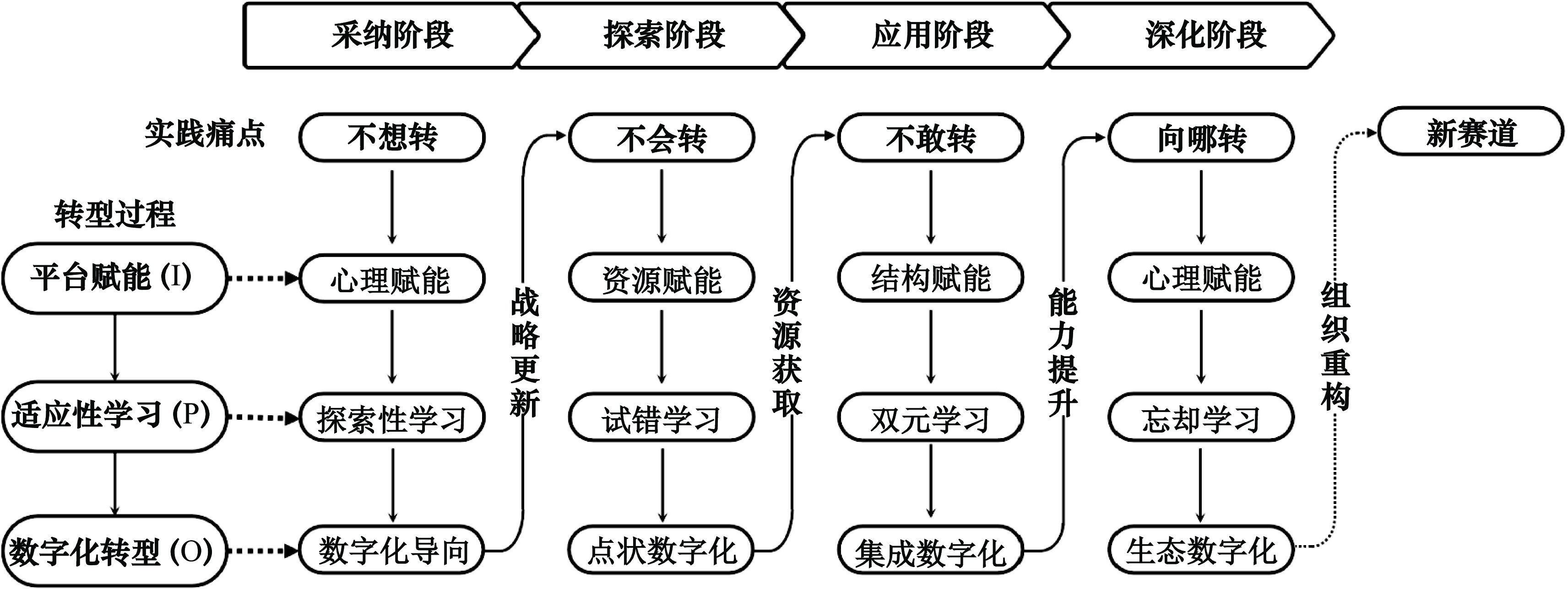 相关研究尽管视角不同,但对数字化转型的关键属性已达成共识:它是一个系统而长期的过程。依据Kane等人(2017)、Gökalp和Martinez(2021)等学者对不同数字化阶段成熟度表现及创新行为扩散过程的解读,企业数字化转型呈现明显的生命周期特征,即从“感知”到“行动”,从“浅层试点”到“连续执行”(Carreiro和Oliveira,2019;Kane等,2017;Gökalp和Martinez,2021)。这种推进过程与数字技术在商业战略中的嵌入程度密切相关,涵盖采纳、探索、应用、深化等演进阶段(Kane等,2017;Wamba和Queiroz,2022)。但目前对于不同阶段的转型差异性缺乏深入探究,动因、过程、结果的单一维度分析也无法精准剖析数字化转型的演进全过程,需考虑内外因素与能力的协同演化,探索实现“全周期数字化转型”的有效路径。