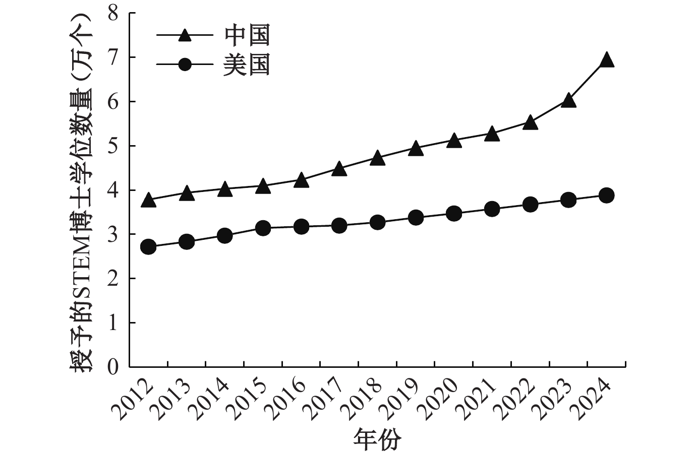 | 图 2 2012—2024年中美两国授予的STEM博士学位数量变化 |