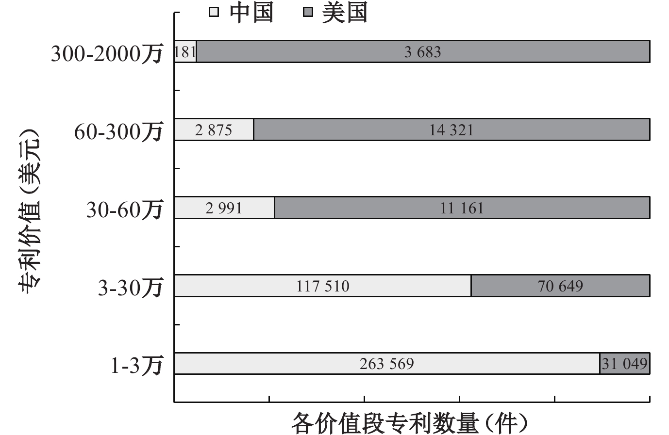 | 图 3 2012—2021年中美两国专利价值分布 数据来源:美国授予的STEM博士学位数据来自美国国家教育统计中心(NCES)的高等教育综合数据系统(IPEDS),中国数据来自教育部。中美两国各价值段专利数据来自《全球数字科技发展研究报告(2023)》 |