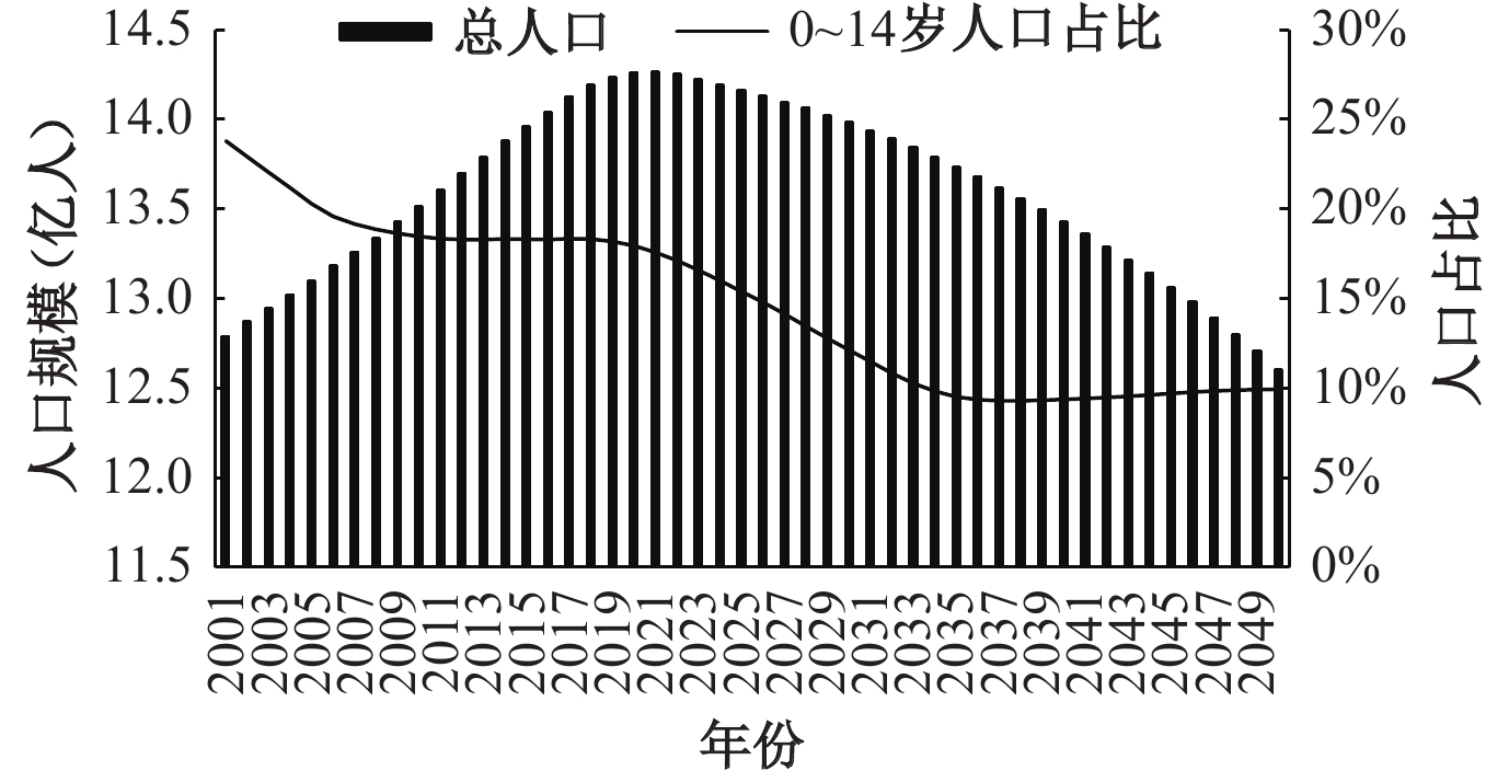 中国人口面临“近忧小,远虑大”的困境,少子化程度持续加剧与人口负增长惯性形成叠加效应,未来人力资源储备将进一步减少,削弱人口自身可持续发展潜力。适度的人口规模和稳定的自然增长率是人口可持续发展的前提,实现人口自身可持续发展,关键在于维持适度生育水平、优化人口年龄结构并保障人力资源长期稳定供给。联合国《世界人口展望2024》预测,2022—2050年,中国人口规模将持续处于负增长状态。受庞大人口基数的影响,人口变动惯性显著,负增长初期速度相对温和,到中后期将大幅提升。图4展示了2001—2050年中国人口规模和0~14岁人口占比变动,预计2030年之前,我国总人口将跌破14.0亿,到2050年更将缩减至12.6亿。与此同时,少子化进程加速推进,预计2035年左右,0~14岁少儿人口占比将下降至10.0%以下。持续的人口规模收缩和年龄结构失衡,严重威胁人口自身可持续发展根基。在人口负增长与少子化的双重冲击下,劳动力的数量和质量受到严重影响。一方面,人口规模下降导致劳动力规模不断缩减,削弱了国家人口支撑能力,长远来看难以满足社会经济发展对人力资源的需求,另一方面,进入劳动年龄人口的新生力量日益萎缩,年轻劳动力补充不足,使得社会整体趋于保守、创新动力减弱、适应变化的能力受限,社会活力有待进一步激发。