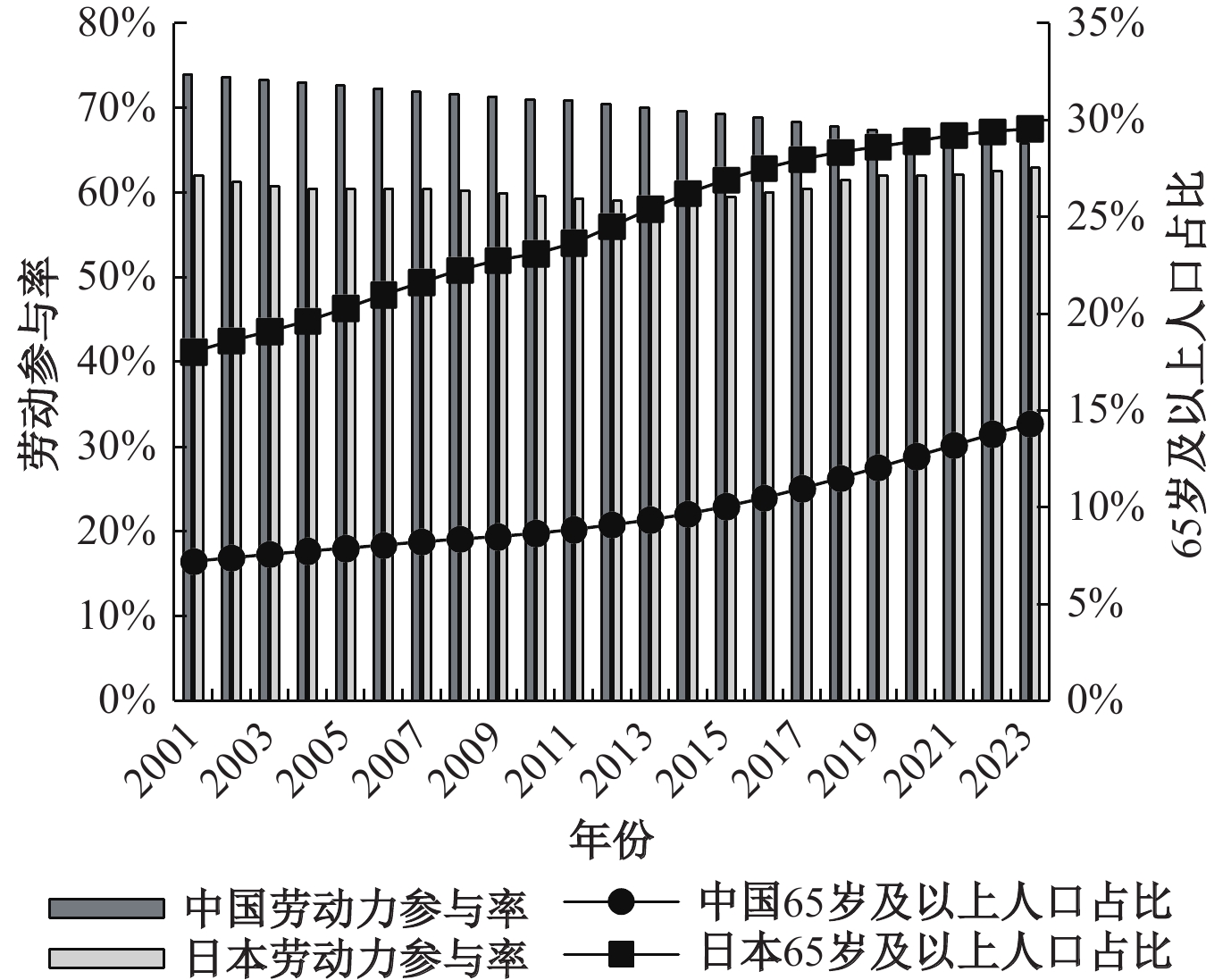 | 图 5 2001—2023年中日两国老年人口占比与劳动 |