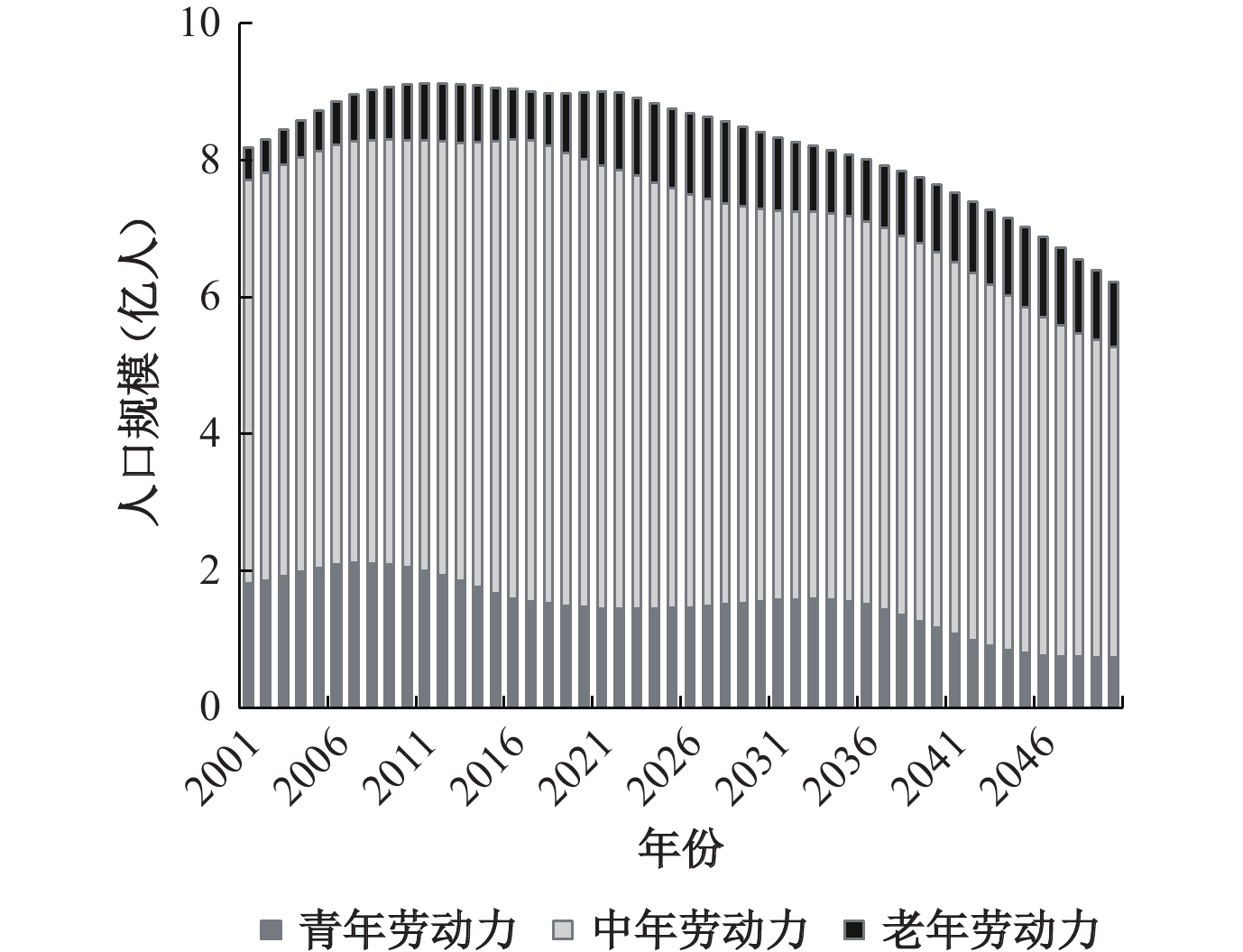 | 图 6 2001—2050年中国劳动年龄人口规模和参与率变化结构变化① 数据来源:劳动参与率由世界银行WDI数据库整理所得,其余数据由《世界人口展望(2024)》整理所得。 |