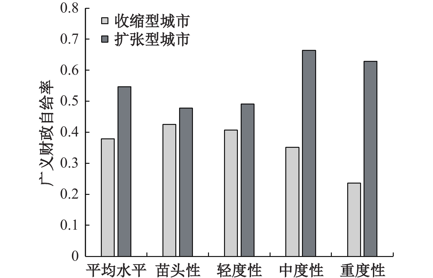 | 图 7 2023年各类城市广义财政自给率 数据来源:《第六次全国人口普查主要数据》《第七次全国人口普查主要数据》《中国城市统计年鉴》及各地级市统计年鉴。 |