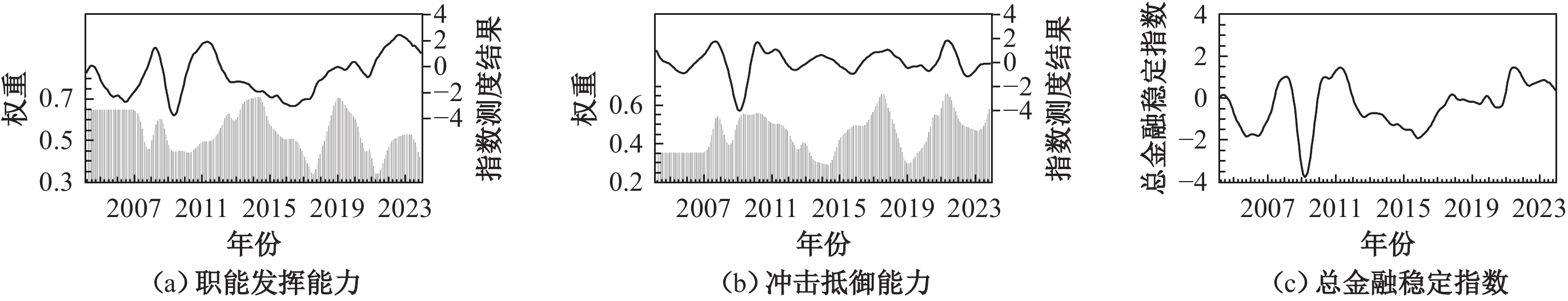 参照邓创和谢敬轩(2021)的做法,本文将滚动时窗大小设定为36期,上述系列结果如图2所示。图2(a)、图2(b)分别展示了职能发挥能力和冲击抵御能力测度结果及其相应动态权重(阴影表示),图2(c)则描绘了总金融稳定指数的演进动态。
